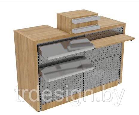 Кассовый стол "Фасоль 2.0" с перфорированной панелью Металокаркас RAL по согласованию, ЛДСП вишня верона(дуб санома). Боковина-2 шт, полка внутренняя навесная 400*650-2шт, полка базовая 400*650-2шт, полка для сумок 200*650*16-1шт, полка для импульсного товара 200*650 с ценникодержателем и ограничителем оргстекло-2шт, столешница с вырезом под дящик (ЛДСП вишня верона(дуб санома)-1 шт, надстройка для моноблока ЛДСП вишня верона(дуб санома)-1шт, полка надстройки для моноблока (оргстекло) - 2 шт, цоколь с пластиком (вишня верона , дуб санома) Фасад перфорированные стенки стенки