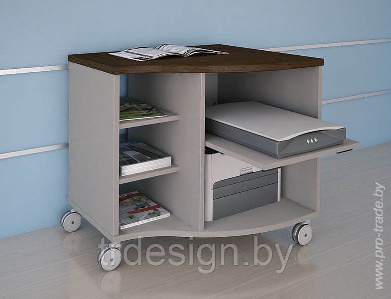 Столешницы, доставки, лицевые панели контейнеров, перегородки и двери стеллажей выполнены в цветах «Берёза натура», «Яблоня Локарно», «Пепел». Основной цвет каркасов столов, контейнеров и стеллажей – «Серый».